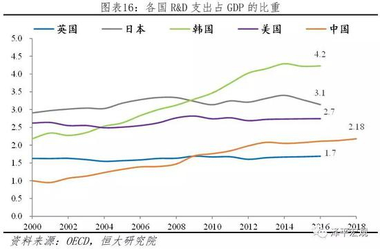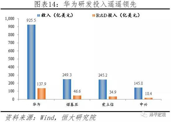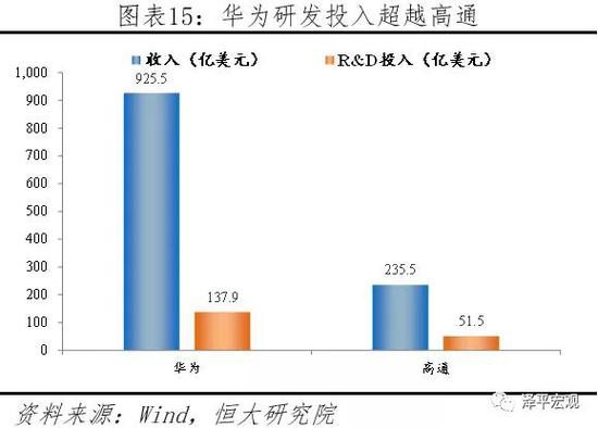 中国不断加大研发投入,在部分高科技领域与发达国家的差距逐渐缩小。2018年我国研发支出占GDP的比重为2.18%,而2000年这一比重仅为1.0%。截至2018年底,国家科技成果转化引导基金累计设立21支子基金,资金总规模达到313亿元。全年境内外专利申请比上年增长16.9%,授予专利权增长33.3%。中国在芯片制造、软件开发、航空等领域与以美国为代表的发达国家仍然存在差距,但中国在持续推进研发。以通信行业为例,当前全球四大通信设备巨头华为、爱立信、诺基亚、中兴,中国占据其二。华为2017年销售额925.5亿美元,研发投入137.9亿美元,大幅超越传统通信设备巨头爱立信与诺基亚。与美国无线通信巨头高通相比,华为的收入与研发投入体量同样领先。在过去十年内,华为在研发领域累计投入近4000亿人民币,目前拥有超过7万份专利(超过90%是发明专利)。在5G的标准制定上,华为也开始崭露头角,中国在全球通信领域话语权逐渐提高。