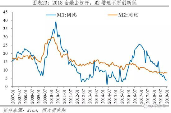 2018中国处于金融周期顶部,流动性退潮,货币金融政策主基调是去杠杆。2018年末年末广义货币供应量(M2)余额182.7万亿元,增长8.1%;全年社会融资规模增量19.3万亿元,按可比口径计算,比上年少3.1万亿元;年末社会融资规模存量200.7万亿元,增长9.8%。年末全部金融机构本外币各项存款余额182.5万亿元,比年初增加13.2万亿元,其中人民币各项存款余额177.5万亿元,增加13.4万亿元。受金融监管趋严,资管新规、MPA考核等影响,表外不断收缩,民企融资难贵问题凸显。
