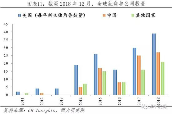 中国新经济具有旺盛活力,跨界创新蓬勃发展。2018年,信息服务业一枝独秀,同比增速高达30.7%。全年软件和信息技术服务业完成软件业务收入63061亿元,按可比口径计算,比上年增长14.2%。从子行业来看,移动游戏、网络购物约车平台、旅游平台、大数据云计算等众多子行业增速达30%-50%。每个子行业都诞生了一批独角兽企业,使得中国企业在全球创新创业领域的话语权迅速提升。截至2018年底,中美独角兽分别占全球比重为28%和48%。未来信息服务业与人工智能、AR、VR技术结合仍将释放巨大的增长潜力,为中国经济发展提供重要动能。