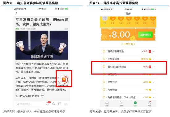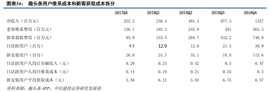 趣头条通过现金奖励老客拉新和使用,通过这种忠诚度奖励来增加活跃用户数。趣头条的用户数增长迅猛,从 2016 年 6 月推出到 2018 年 12 月,MAU 已经达到 9380 万。收入方面主要是广告,广告收入占 2018 年收入的 93%。2018Q4 趣头条的日活跃用户的参与成本为 0.2 元/人/日,新用户的获客成本为 6.57 元/人。虽然还比较低,但是考虑到趣头条的 MAU 还仅有 9380 万。 根据我们测算,拼多多 2017Q3 年度活跃买家数达到 1.57 亿的为 时候,老客维系成本为 0.012 元/ 人/日 日为 ,获客成本为 5.49 元/ 人。阿里巴巴在 2013Q3 年度活跃买家数达到 2.02为 亿的时候,老客维系成本为 0.027 元/ 人/ 日,获客成本为 12.17 元/ 人。所以考虑其较低的用户体量,趣头条的获客成本和老客维系成本并没有特别低。这也从一个侧面反映了目前互联网流量已经进入一个存量博弈的阶段。