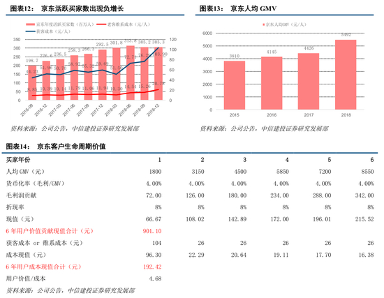 京东的活跃买家数在 2018Q3 出现负增长,环比减少了 860 万。2018 年 Q4 活跃买家数企稳,环比增加 10万人。获客成本从 2016Q3 的 44.23 元/人上升到 2018Q4 的 103.90 元/人。京东的毛利润与 GMV 的比值为 4%左右。考虑到京东 2018 年的 GMV 为阿里的 0.6 倍,所以假设京东不同年份用户的人均 GMV 为阿里的 0.6 倍。假设折现率为 8%,我们得到用户 6 年内贡献的收入现值合计为 901.10 元,大于获客成本和维系成本现值 192.42元。