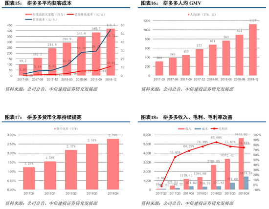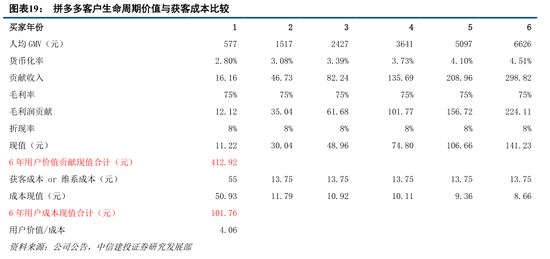 拼多多早期主要通过拼团等社交玩法,依托微信生态获得用户,因此获客成本较低。随着用户数增加,获客成本也增加,获客成本从2017Q2的1.95 元/人上升到2018Q4的54.71 元/人。人均GMV 也持续上升,从2017Q3的 309 元上升到 2018Q4 的 1127 元。根据我们测算拼多多用户第一年的平均 GMV 为 577 元,第二年为 1517 元,假设第三年、第四年、第五年、第六年的用户 GMV 同比增长为 60%、50%、40%和 30%。货币化率为 2.80%,并每年增加 10%。我们得到用户 6 年内贡献的收入现值合计为 412.92 元,大于获客成本和维系成本现值 101.76元。
