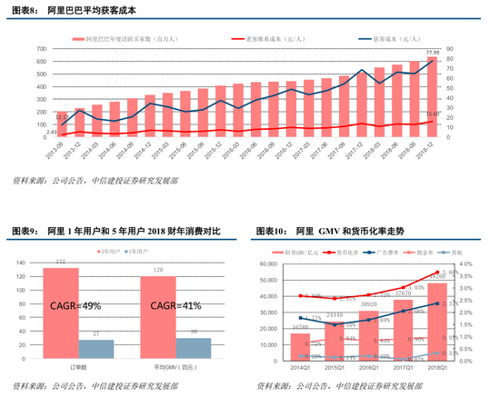 根据行业经验,互联网平台获得一个新用户的成本,是维护一个老用户的 5—10 倍。我们假设新用户的获客成本是老用户维系成本的 5 倍。经过测算,阿里巴巴的平均获客成本从 2013 年 9 月的 12.17 元/人上升到 2018年 12 月的 77.99 元/人。用户人均 GMV 方面,随着用户使用年份越久,其人均购买次数和人均 GMV 都会高于新用户。阿里巴巴 2018 财年年报中披露,使用 5 年的老用户全年下单 132 次,总额 12000 元,而使用 1 年的新用户全年下单 27 次,总额 3000 元。假设前几年的人均 GMV 线性增加,按 2018 财年的货币化率 3.66%,考虑到阿里巴巴已经比较成熟,折现率 8%,我们得到用户 6 年内贡献的收入现值合计为 1231.74 元,大于获客成本和维系成本的现值合计 144.31 元。