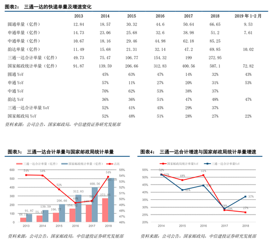 综上,整个快递行业目前来看还在争地盘争市占率的背景下,快递收费对淘宝,拼多多等平台上的卖家还处于友好期,这个假设前提非常重要。同时三通一达的电商包裹去向切片数据来看,也确实印证了低线城市人口逐步接受电商,即我们的活跃买家数还在增加的前提,这些都是电商增速的中微观基本盘,从目前邮政给的快递包裹量数据及 2019 年增速指引看,我们认为整个电商行业基于包裹量的增速在 20-25%,电商还是一个快速增长的行业。