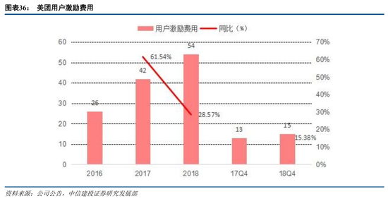 美团最新财报显示,2018Q4 外卖业务收入比 2018Q3 环比减少 1.5%,该减少乃受总交易金额增长放缓及变现率由 14.0%降至 13.7%影响。变现率环比略为下跌因为竞争加剧及宏观经济逆转导致补贴增加。除了部分补贴以收入冲销的方式,还有部分是用户激励费用。2018Q4 美团用户激励费用提升至 15 亿元,同比增长 15.38%。根据我们的草根调研的结果,美团补贴率约为竞争对手的一半,大概 3%左右。由于草根调研的局限性,补贴率可能与事实有所出入。