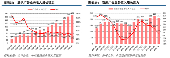 同时我们也观察到腾讯、微博等非电商类互联网公司的广告业务收入在 4 季度都出现了明显的高峰。我们认为四季度时候电商平台和电商卖家在向外部大量购买流量。但是我们也观察到随着经济不景气,广告主的支出降低。2018Q4 腾讯的网络广告业务收入同比增长 38%,增速低于 2018Q3 的 47%,也低于 2017Q4 的 49%。我们认为在经济持续减速、广告主预算吃紧的情况下,互联网公司广告业务收入增速也将放缓。百度在线营销收入在总营收中占比保持高达 95%以上。但近两年因搜索业务竞争加剧以及部分广告引发的社会事件导致流量红利逐渐流失,2018Q4 百度活跃客户为 52.9 万家,同比增长 15%,客户人均花费 4.01 万,同比下降 4%。广告业务收入增速逐渐下降,2018Q4 增速降至 4%,百度需要采取新的策略吸纳存量流量并变现。