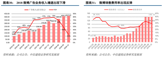 微博的广告收入主要来自中小企业以及核心客户的广告投放,微博提供了展示类、信息流等多种广告形式。因为微博具有社交属性,而且用户关注是根据自身兴趣,关系流叠加兴趣流,提高了微博广告的转化率。成本方面,微博需要和智能手机厂商、广告媒体、头部 APP 等合作在营销上进行互补,获得外部流量。在 2017-2018年经历 70%以上的高速增长后从 2018Q1 开始逐渐放缓。2018 年四季度,微博的中小客户同比增速仅 8%,品牌客户的收入也在三年中首次超过中小客户。市场竞争的日趋激烈、供给大幅增加带来的价格压力,一定程度上影响了微博广告收入的增长。另一方面销售费用率从 2016 Q3 开始反弹,从 21.52%上升到 2018Q4 的 29.16%。