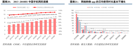 中国移动互联网用户规模增长放缓,网络购物 app 的日均使用时长基本不变。截止 2018 年 6 月,我国手机网民用户 7.88 亿,同比 2017 年 6 月增长 8.84%。手机网民占全体网民的比重也由 2013 年 6 月的 78.5%提升至2018 年 6 月的 98.3%,移动互联网的用户规模逐渐接近天花板。另一方面网络购物类 app 的日均使用时长基本不增长。根据极大数据的统计,网络购物 app 的日均使用时长从 2017Q4 的 11.1 分钟下降到 2018Q3 的 8.6 分钟,仅占用户日均 4 小时左右使用时长的 4%左右。日均使用时长最长的是社交类 app,其次是网络视频类 app。由于短视频的兴起,2018Q2 网络视频类 APP 的使用时长增加,因为移动网民的日均使用总时长在 4 小时左右,所以社交网络类 APP 的时长相对减少。