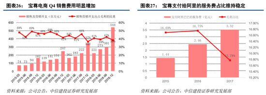 电商服务公司宝尊电商销售费用的高峰也出现在 4 季度,且销售费用占毛利的比重出现小幅反弹。宝尊作为电商代运营公司,广告及推广费用中包含了宝尊为品牌客户提供的推广营销服务的成本,因此在电商营销旺季的四季度,宝尊的销售费用也水涨船高。考虑到宝尊电商在从经销模式(承担库存,收入确认为商品销售收入)向代理模式(不承担库存,收入确认为服务费)转型,因此我们计算销售费用占毛利的比重,剔除了商品成本的影响。宝尊电商的销售费用占毛利的比重在 2017Q4 之前呈现下降趋势,但是到了 2018 年略微出现反弹。2017Q4 的销售费用占毛利的比重为 37%,2018Q4 上升到了 39%。另外 2015、2016、2017 年宝尊付给阿里巴巴的服务费分别为 1.44 亿元、2.46 亿元和 3.52 亿元,主要为营销服务,占当期宝尊电商毛利的 16.69%、16.75%和 15.78%。宝尊电商购买流量的成本占比基本维持稳定。