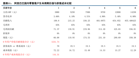 经验来说,互联网平台获得一个新用户的成本,是维护一个老用户的 5—10 倍。我们假设新用户的获客成本是老用户维系成本的5 倍,折现率为 8%。经过测算阿里巴巴、京东、拼多多的 6 年用户价值贡献现值/6 年用户成本现值的比率分别为 8.54、4.68、4.06。