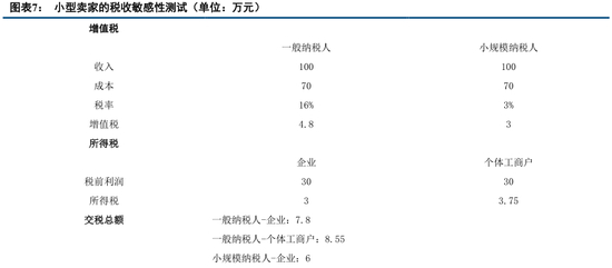 我们对小型卖家的税收做了敏感性测试。假设一个小型卖家,就是夫妻两人,年销售额为 100 万(不含税),利润率为 30%(这个假设没考虑这对夫妻的职工薪酬)。因为是小卖家,假设,对他们而言,店铺成本主要是商品进货成本以及广告推广费用,且都能取得增值税专用发票。如果卖家申请为一般纳税人,适用 17%的增值税税率,则需要缴纳 5.1 万元的增值税。如果申请为小规模纳税人,适用 3%的征收率,则需要缴纳 3 万元的增值税。所得税方面,如果登记为企业,则享受小型微利企业的所得税减半优惠,30 万元的利润需要缴纳 3 万元所得税。如果登记为个体工商户,则适用五级超额累进税率,所得税为 3.75 万元。综合来说在不考虑其他小税种的情况,对这个卖家而言,一般纳税人-企业需要缴纳 7.8 万元,一般纳税人-个体工商户需要缴纳 8.55 万元,小规模纳税人-企业需要缴纳 6 万元,小规模纳税人-个体工商户需要缴纳 6.75 万元。也就是至少要交 6 万元的税,净收入从 30 万元降低到 24 万元。