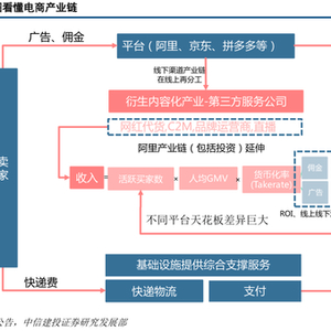 电商产业链主要有四类玩家:(1)阿里、京东、拼多多、唯品会、苏宁等平台型公司;(2)上游的物流供应链公司,典型的诸如三通一达,菜鸟网络;(3)伴随着成长的第三方服务商比如线上代运营公司(如宝尊电商),众多的移动广告营销公司,品牌运营公司诸如南极电商,直播网红经纪人团队,网红品牌运营商比如最近提交美股 IPO 招股的如涵控股等等;(4)海量卖家。