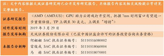 伴随5G的逐步落地,云游戏在速度、延迟和视频传输容量方面获得优化和进步的契机,我们认为云游戏对于推动大型游戏的可及玩家普及有重要意义。而AMD作为Google云游戏的算力支持方,GPU性能获得背书,也有望打开数据中心高端GPU的高利润市场。虽然未公布具体使用GPU,但AMD在18年底发布数据中心GPU Radeon Pro V340,含2块Vega 14nm GPU、112颗计算单元、32GB HBM2内存,单精度浮点性能达21.5 TFLOPS,基本与Stadia需求一致,目前零售价约为1.1万美元。