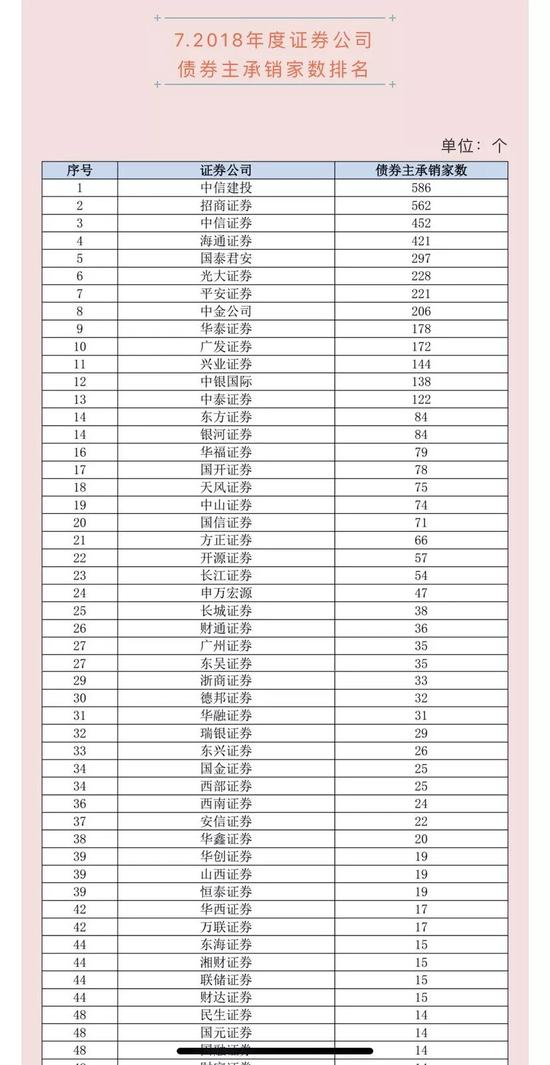 具体来看,2018年公司债主承销家数超过100家的证券公司只有7家,公司债承销业务资源向头部券商集中的趋势比较明显。