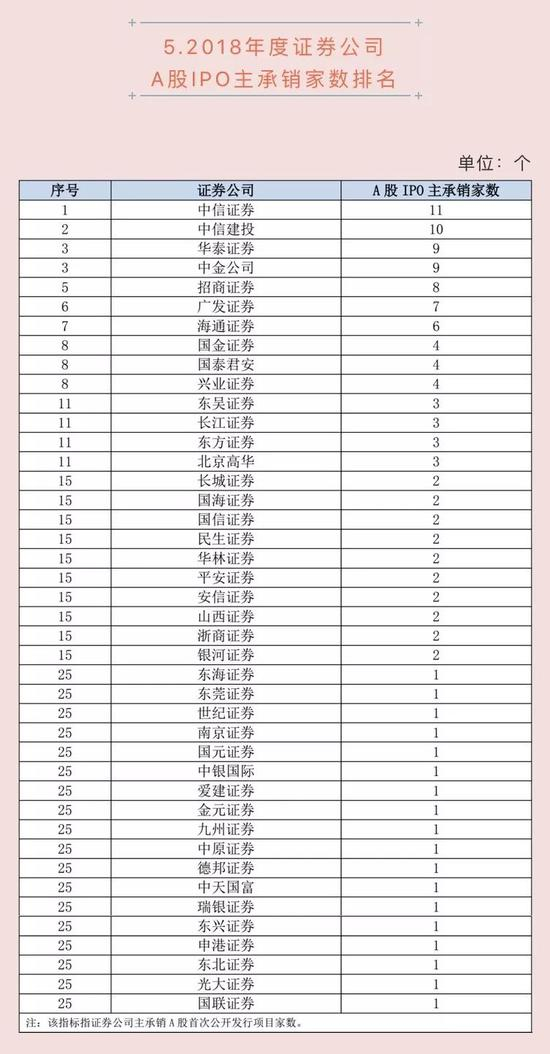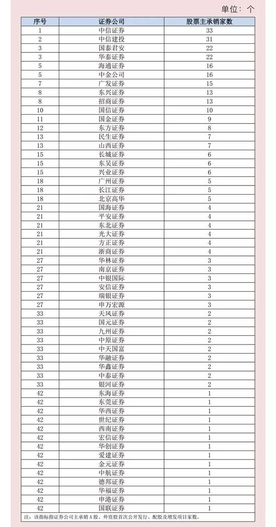 中证协数据显示,去年A股IPO主承销家数超过5个的券商共有7个,中信证券、中信建投分别以11家、10家的数量绝对领先,华泰证券、中金公司、招商证券分别以9家、9家、8家的数量紧随其后。