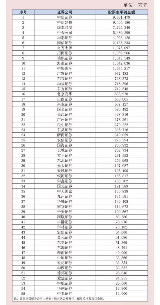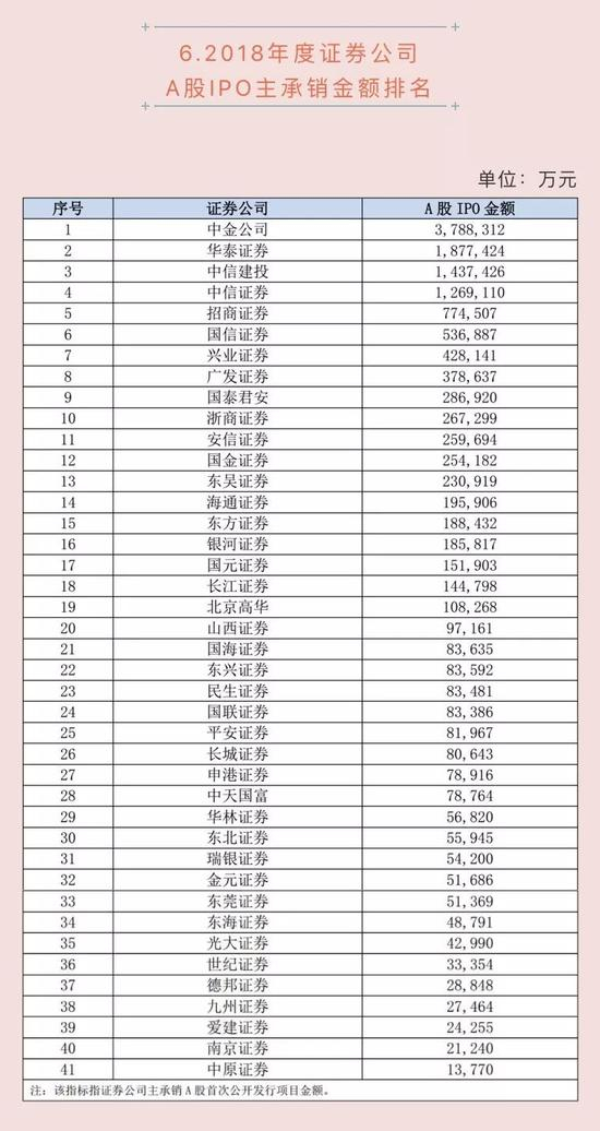 此次公布的年度证券承销业务“成绩单”包括了2018年证券公司股票主承销家数及金额排名、债券主承销家数及金额排名,以及各子项目的具体排名情况。
