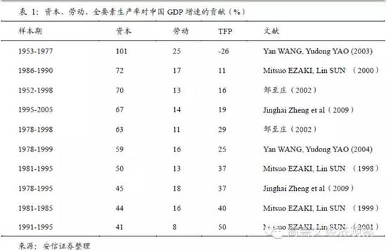一般认为经济的长期趋势取决于供应能力的演化。从经济学角度来看,经济的总供应能力可以分解为劳动力供应、资本存量和全要素生产率(可用以衡量技术进步)。更为微妙的一个变量是资本系数,即经济增长对资本的弹性。我们将学术文献中,劳动力、资本投入和技术进步对中国经济增长贡献的研究成果总结如下: