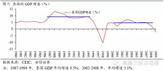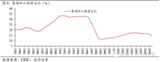 例如泰国在20世纪80年代后期到90年代中期的十年中,经济增速平台在9.5%附近。这一经济增速平台的提升依靠的是国外资本流入及投资的上升,总量数据表现上,私人部门投资占比从这一时期之前的20%左右上升到35%附近。