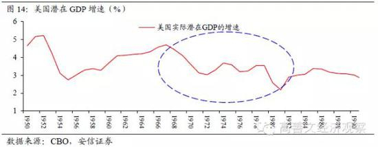美国在20世纪60年代后期开始,潜在GDP增速出现了趋势性的下降。这一趋势延续较久,直至80年代初期才基本结束。美国经济在这一期间为何会出现潜在经济增速趋势性的放缓,目前仍不是非常清楚。常见解释有人口结构的变动,技术进步的放缓等;少数解释将之归因为计算机技术的部署导致学习成本的上升。近四十年的时间过去之后人们对这一趋势仍然没有达成一致的理解。