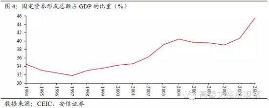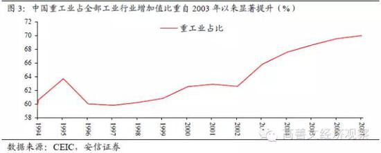 重化工业占比提升伴随着固定资本的快速积累,反映在总量层面上我们就看到了固定资本形成总额占GDP比重自2003年起上升了一个平台。此前这一比例均值略高于30%,2003年以来均值上升到40%以上。