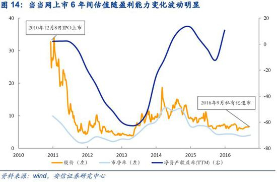 低ROE,高PB:成长股投资中的风险,以当当网为例。同样作为在美股上市的电商中概股当当网(DANG.N)命运坎坷了许多,在上市仅六年后当当网便开启了私有化进程从美股退市。当当网上市当年尚能保持2.05%的净资产收益率且截至2016年12月31日企业市净率达到了9.91,但企业盈利能力在随后两年中没有出现增长反而断崖式下降。在当当网用户数量流失市场份额减少的同时,同样在美股上市的淘宝、京东等电商中概股业绩反而出现了提升,投资者自然转投其他发展潜力更大的企业。2013年当当网特卖模式提振盈利能力,但其主营业务模式单一的状况并没有得到改善,尽管当当网尝试转型综合购物商城,媒体(图书音像)营业收入占比始终保持在60%左右。而同一时间,淘宝、京东等电商纷纷通过仓储物流、云计算服务等业务来增加收入。