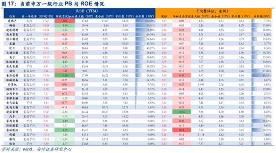 一级行业中,属于低ROE、低PB的行业有纺织服装、非银金融、汽车、化工、交通运输、商业贸易、公用事业、采掘。