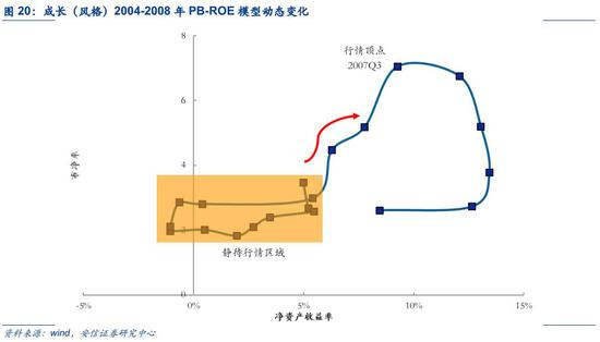 因此,我们在动态模型中将采用历史数据回测而非使用预期盈利数据。具体而言,我们采用历史行情中企业盈利能力(ROE)和估值数据(PB)的时间序列,进而找到PB-ROE在模型坐标系中的动态路径,目的在于发现企业在行情不同阶段时的盈利表现和估值水平变动规律并总结其对于成长股投资的启示含义。
