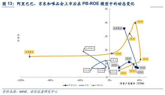 低ROE,高PB:成长股投资中的机遇,以京东为例。以在美股上市的电商中概股为例,阿里巴巴、京东、唯品会和拼多多四家企业最新报告期净资产收益率相较于上市时都有所增加。除阿里巴巴上市之初净资产收益率便达到19.50%外,京东、拼多多和唯品会上市时都处于亏损状态分别为-35.38%、-37.86%和-107.80%,京东直到2018年第一季度才扭亏为盈。即便如此投资者仍看中企业预期发展潜力而愿意支付相当高的溢价,阿里巴巴上市当天市净率达到了35.88,上市时亏损状态的京东、拼多多和唯品会分别为18.85、160.40和15.21。从历史数据中我们发现,虽然唯品会仍保持10%左右的净资产收益率,但其估值近年来总体呈现下降趋势,而京东虽然盈利水平自2017年缓慢增长至2018年才扭亏为盈,但投资者仍看好其预期发展能力,因此2017年至2018年初京东股价大幅上涨。在动态PB-ROE模型中可以看到,京东和唯品会在模型中呈现出从左上方向右下方移动的趋势,阿里巴巴则由于一直保持相对较高的净资产收益率,在模型中向下移动。