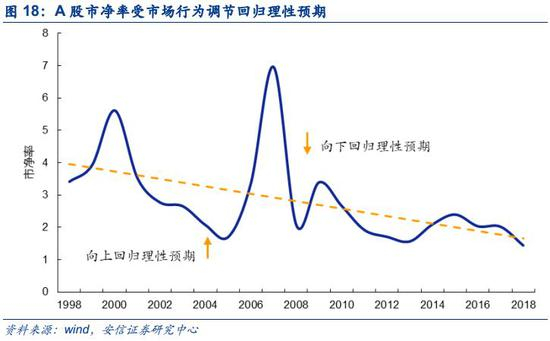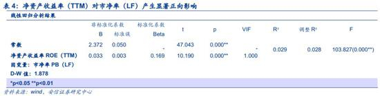 其次,市净率受净资产收益率影响回归理性预期。对净资产收益率和市净率进行线性回归分析,我们发现净资产收益率会对市净率产生显著正向影响。这主要是因为受盈利预期、市场环境等因素影响,投资者对于企业估值的理性预期也处在动态变化中,理性预期并没有具体数值而是各投资者根据分析大致的一个判断,因此在市场中会出现股价高于或低于理性预期的情况。在这些情况下,市场能够通过市场行为调节实际市净率回归其理性预期。同时,实际市净率的高估、低估又会影响净资产收益率。投资者行为受到实际市净率相对于理性预期高低的影响,市净率低估则投资者大量购入股票,实际市净率向上回归理性预期。大量购入的股票反过来也导致企业所有者权益的大幅增长,若企业未能合理利用这笔资金,在净利润未出现显著增长的情况下,所有者权益的增长导致预期的净资产收益率下降。因此投资者的市场行为也能促使净资产收益率的回归,但是这个过程相较于市净率的回归更加缓慢且滞后。