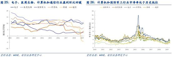一级行业中,属于低ROE、高PB的行业有农林牧渔、计算机、医药生物、电子、通信、国防军工、轻工制造、传媒、电器设备、机械设备、有色金属,包含所有的高成长性行业。
