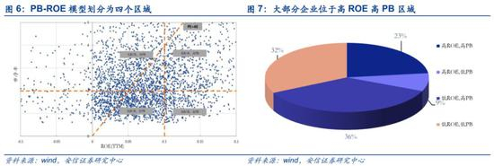 从当前来看,上市公司在低ROE、高PB区域分布最多,低ROE、低PB次之。我们根据当前全部A股,以净资产收益率(TTM)=10%和市净率=2(全A非金融石油石化平均水平)为临界值,将A股所有公司划分为以上四个区域。可以看到,从个股分布的角度来看,目前大部分企业处于模型的左上方和左下方,即低ROE高PB区域和低ROE低PB区域。其中,低ROE高PB区域占比最高,为36.17%。此外,高ROE高PB区域、高ROE低PB区域和低ROE低PB区域的个股占比分别为23.04%、8.43%和32.36%。
