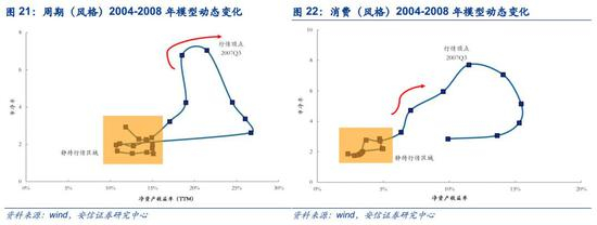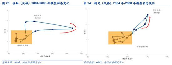 事实上,我们发现:以2004年-2008年为例,在成长(风格)PB-ROE模型动态变化中,PB和ROE的变动呈现顺时针方向,也就意味着PB的变动是领先于ROE的变动,而在ROE见顶之前,PB开始逐步回落。这点与我们的理论预期一致,同时在周期和消费风格上也发现了相似的特征。区别是成长股在ROE提升时,估值提升较快,同时回落的速度也较快,而周期和消费则相对缓和。因此,不难看出对于成长股ROE趋势的判断在PB-ROE模型中占据主导。此外,有趣的是金融和稳定风格呈现出逆时针移动的趋势。换句话说,金融和稳定风格市场估值的变化滞后于盈利的变化,而成长、消费和周期风格盈利水平变化滞后于估值的变化。