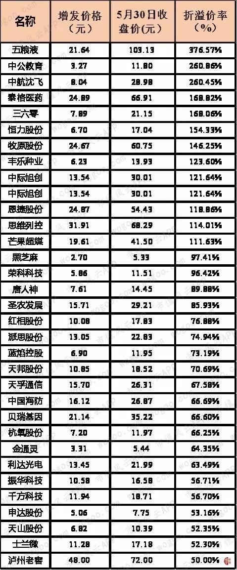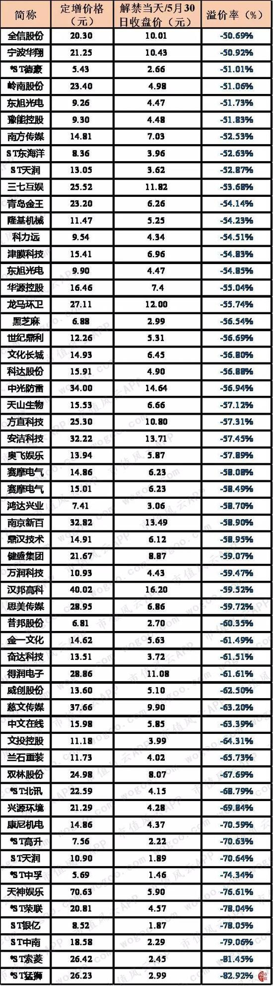 风云君整理汇总了这部分股票,下图是解禁当天或2019年5月30日的收盘价与定增价格的折溢价率: