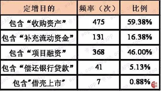 研究后发现,在统计区间内,定增预案里公布的定增目的往往不止一个,那么上市公司伸手要钱的常见理由有哪些呢?