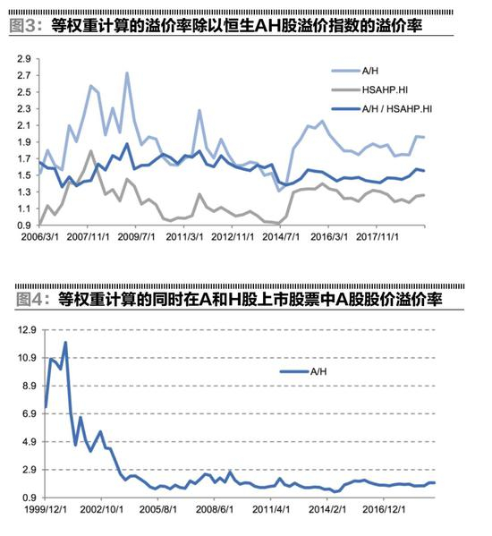 这两种比较的区别意味着,如果投资者预期未来A股和H股的比价,会在长期逐步下降、最终可能趋近于零,那么等权重计算方法计算出的溢价率,会预示着H股,以及与之同一估值体系的港股,当前的相对价值更大。