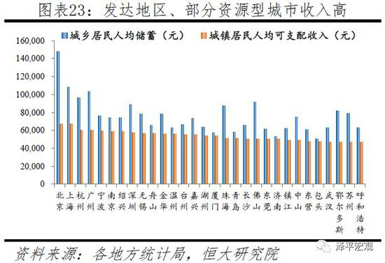 一线城市人均储蓄存款、可支配收入分别高达11.5、6.6万元,远高于其他城市。绝对购买能力不仅是可支配收入,还应包括人均储蓄存款,尽管当前“存款搬家”现象明显,但仍能反映相关情况。从城乡居民人均储蓄存款看,2017年一线、二线城市分别为11.5、6.6万元,三线、四线城市分别为4.1、3.2万元。从城镇居民可支配收入看,2017年一线、二线城市分别为6.4、4.5万元,三线、四线城市分别为3.6、3.1万元。此外,包头、鄂尔多斯、呼和浩特等部分资源型城市人均储蓄存款及可支配收入也较高。