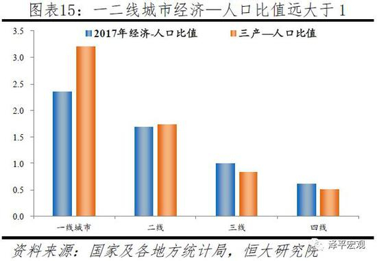 一二线城市以25.5%的人口创造了46.5%的GDP,人口集聚潜力很大。当前一线城市以5.2%的人口创造了全国12.3%的GDP,二线城市以20.3%的人口创造了34.1%的GDP,三线城市的人口份额与经济份额基本持平、分别为33.9%、34.0%,四线城市的人口份额明显低于经济份额、分别为39.7%、24.5%(因统计问题,地区GDP合计与全国存在差异)。从经济—人口比值来看,2017年一、二、三、四线城市分别为2.4、1.7、1.0、0.6;从剔除工业因素的第三产业-人口比值看,2017年一、二、三、四线城市分别为3.2、1.7、0.8、0.5。从经济增速看,2015-2017年,一线、二线、三线、四线城市年均经济增速分别为7.5%、7.9%、7.8%、6.8%,四线经济规模基数小、但增速仍然乏力。从区域看,近几年经济增速比较低的地区是辽宁、山西等数据挤水分地区及东北、西部等偏远地区,经济增速多在6%以下;而中部不少地区经济增速在8-10%之间,西南部分地区更是在10%以上。总体上看,未来人口将继续向大都市圈和区域中心城市集聚,三四线城市全域人口未来将继续大幅流出。