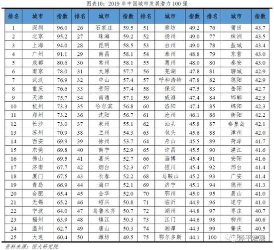 2019年深北上广稳居中长期发展潜力榜单前4名,二线城市中成都、南京、武汉、重庆、天津、杭州位居前十;东部地区有32座城市进入前50名,东北地区有超八成城市位于200名之后。百强城市以全国13%的土地,集聚50%的人口,创造约73%的GDP,占全国商品住宅销量的约62%。深圳占据城市发展潜力榜首,北京、上海、广州紧随其后。二线城市中,成都、南京、武汉、重庆、天津、杭州位列前10名;郑州、长沙、西安、济南、合肥等省会城市,厦门、青岛等计划单列市,苏州、东莞、佛山等发达地级市进入前20名。省会城市除呼和浩特、银川、西宁、拉萨外均排名前50。在前50名城市中,东部地区多达32个,中部、西部、东北地区分别有6、8、4个。除直辖市、省会城市和计划单列市外,前50名其余地级市大多分布在长三角、珠三角地区,其中长三角城市群8个,珠三角城市群4个,海西城市群、山东半岛城市群各2个。分地区看,东部、中部、西部地区排在200名之后的城市占比分别为4.6%、22%、64.1%;东北地区有30座城市位列200名之后,占本区域地级单位个数的83.3%,发展潜力总体靠后。需注意,各指标经标准化处理后合成的发展潜力指数仅具备序数意义。
