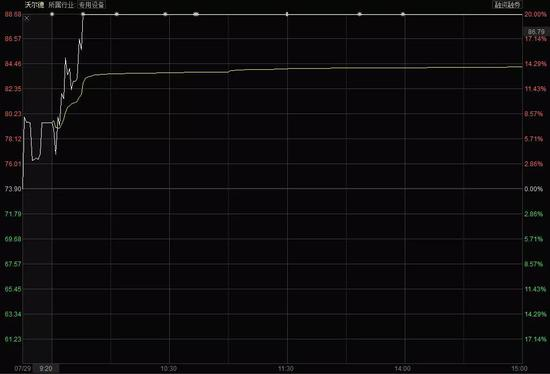 其中,8只个股涨幅超过10%,12只个股涨幅在5%~10%之间。而最为强势的当属沃尔德,开盘不到2分钟就出现了快速拉升,大约15分钟后即拉至涨停,并且一直封死至收盘。