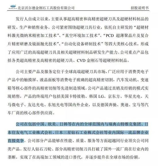 而最重要的是下面这一句:“公司在包括中国、欧美、日韩等在内的全球范围内与瑞典山特维克集团、日本住友电气工业株式会社、日本三星钻石工业株式会社等业内国际一流品牌企业直接竞争。”这也就意味着,沃尔德的竞争对手面向的是全球企业,国内尚没有能够与之竞争的同类企业,也即是其行业地位在国内具有稀缺性和唯一性。