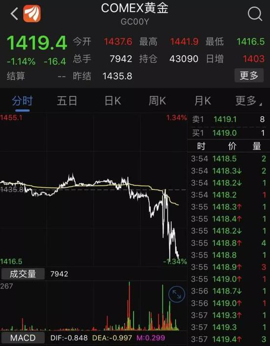 黄金价格快速杀跌,跌幅达1%