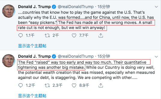 据不完全统计,今年以来特朗普通过各种渠道对美联储“喊话”的次数接近20次,“疯了、荒谬、搞砸了”之类的词汇屡屡出现,他多次表达了对美联储主席鲍威尔工作的不满,甚至“建议”由欧央行行长德拉吉来掌管货币政策。