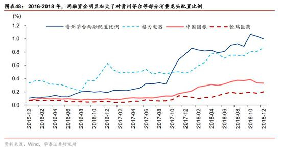 以贵州茅台、格力电器、中国国旅、恒瑞医药四只消费龙头为例,2016-2018年期间,两融资金对四家公司的配置比例分布变动0.89/0.53/0.26/0.13pct,期间涨幅分布对184.41%、81.39%、110.56%、102.20%。