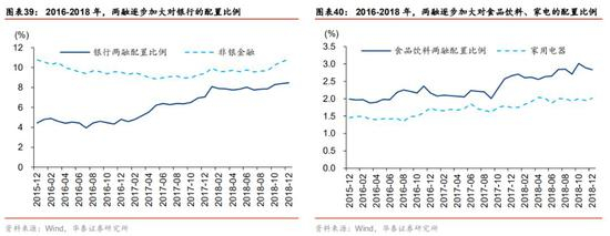 2018年,市场大跌,防御型板块和核心资产获资金抱团。两融资金总体以增持银行和非银金融为主,医药、食品饮料、家电、休闲服务等消费板块配置比例提升亦比较明显。一季度两融资金开始增持银行和非银金融(0.80pct和0.23pct),二季度继续增持(0.16pct和0.13pct),三季度减持银行(0.15pct)后,四季度继续增持银行和非银金融(0.60pct和1.14pct)。一季度和二季度,尽管多数行业下跌,配比增幅前五行业的平均涨幅分别为-0.36%和-12.22%,依旧优于后五行业的表现(-6.26%和-16.77%)。但下半年配比增幅前五行业的表现逊于后五行业。