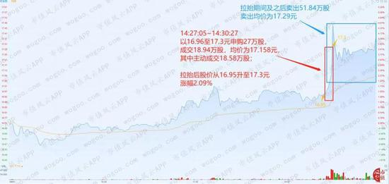 拉抬期间及随后半个小时卖出51.84万股,占市场卖成交数量的14.30%,卖出金额达896.4万元,卖出均价17.29元。
