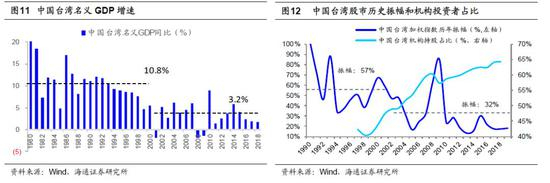 台湾加权指数波动幅度在2000年之后降低。台湾加权指数在1990-2000年之间年平均振幅中枢为57%,2000年以来降至32%。从经济增速来看,台湾在1980-2000年之间名义GDP平均为10.8%,2000年以来降至平均3.2%。投资者结构方面,2000年之后台湾投资者结构出现两大变化。一个是机构占比明显上升,台湾股市机构投资者持股占比从2000年的44%升至2018年64%。另一方面是外资流入,在2000年12月底台湾全面取消外资持股比例上限之后,台湾市场外资持股比例显著上行,从2001年的8.8%快速提高至2008年的25.8%,目前(2018年)维持在26%左右,详见前期报告《借鉴台韩:外资改变估值体系和波动率——A股国际化系列1 - 20170719》。