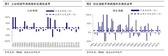 实际上,股市年涨跌幅大幅偏离长期收益率。如果对比各国/各地区股市历年涨跌幅和股指长期年化涨幅,就会发现二者之间很少重合。如上证综指1991年以来长期年化涨幅为12.2%,而实际上从1991年以来的29年中上证综指年涨跌幅与之接近的仅有1年,即使放宽幅度,涨幅在8%-16%之间的年份也只有2年,占比约7%。恒生指数从1964年以来长期年化涨幅为10.4%,在港股56年历史中恒生指数年涨跌幅在6%-14%之间的年度仅有3年,占比5.4%。标普500指数从1928年以来长期年化涨幅为5.5%,从1928年以来的92年中标普500指数涨幅在1.5%-9.5%之间的仅有8年,占比8.7%。正如霍华德马克思在《周期》中写过:“一个摆动的钟摆,也许会摆到中心点——相当于“平均水平”,但它在中心点停留的时间及其短暂,可以说是一晃而过。股票市场经常大幅偏离正常收益水平,在很大程度上要归因于投资人的心理和情绪像钟摆一样大幅摆动”。