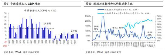 港股波动幅度在2000年后快速降低。恒生指数年平均振幅从1980-2000年的65%降至2000年后的48%。而香港名义GDP增速在2000年后同样明显放缓,1962-2000年之间香港名义GDP增速为14.8%,2000年之后降至4.2%。从投资者结构来看,从2000年以来香港机构投资者占比大幅提升,港股个人投资者交易占比从2000年的51.5%降至2018年的16%,机构投资者交易占比从2000年的48.5%升至2018年的84%。