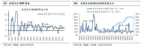 道琼斯指数波动幅度在1970年之后降低。美国道琼斯指数在1970年之前年平均振幅中枢为39%,1970年至今降至28%。这与美国经济增速以及投资者结构的变化有关。美国实际GDP增速在1930-1970年之间平均4.8%,1970-2000年间降至平均3.2%,2000年至今进一步降至2%。并且美国机构投资者占比在1970年之后明显上升,美国机构投资者持股占比从1970年的21%持续上升至2018年的57%左右。