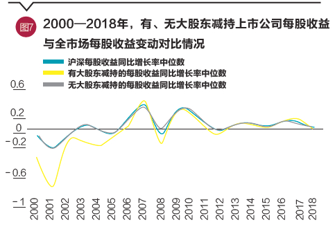 从对公司业绩的关系和影响来看,2000—2018年共19年期间,共有15年有大股东减持的上市公司在减持当年的每股收益较上年同比增长率低于无大股东减持的上市公司,有4年有大股东减持的上市公司在减持当年的每股收益较上年同比增长率高于无大股东减持的上市公司。在近五年间,其中有3年有大股东减持的上市公司在减持当年的每股收益较上年同比增长率低于无大股东减持的上市公司,有2年有大股东减持的上市公司在减持当年的每股收益较上年同比增长率高于无大股东减持的上市公司,因此,大股东减持行为与上市公司业绩的相关性并不明显(见图7)。